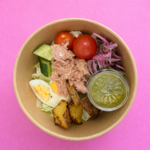 Vištienos lizdeliai su bulvių koše, gaiviomis salotomis.