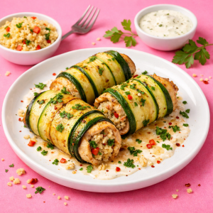 Vištienos vyniotiniai su cukinija, kuskusu.